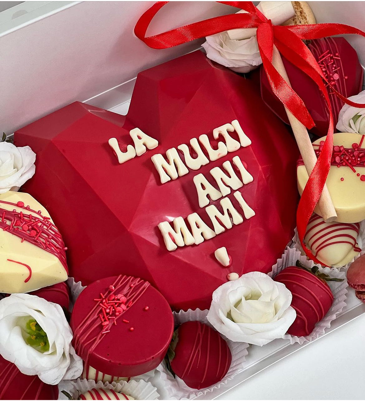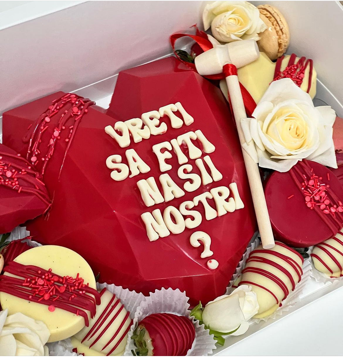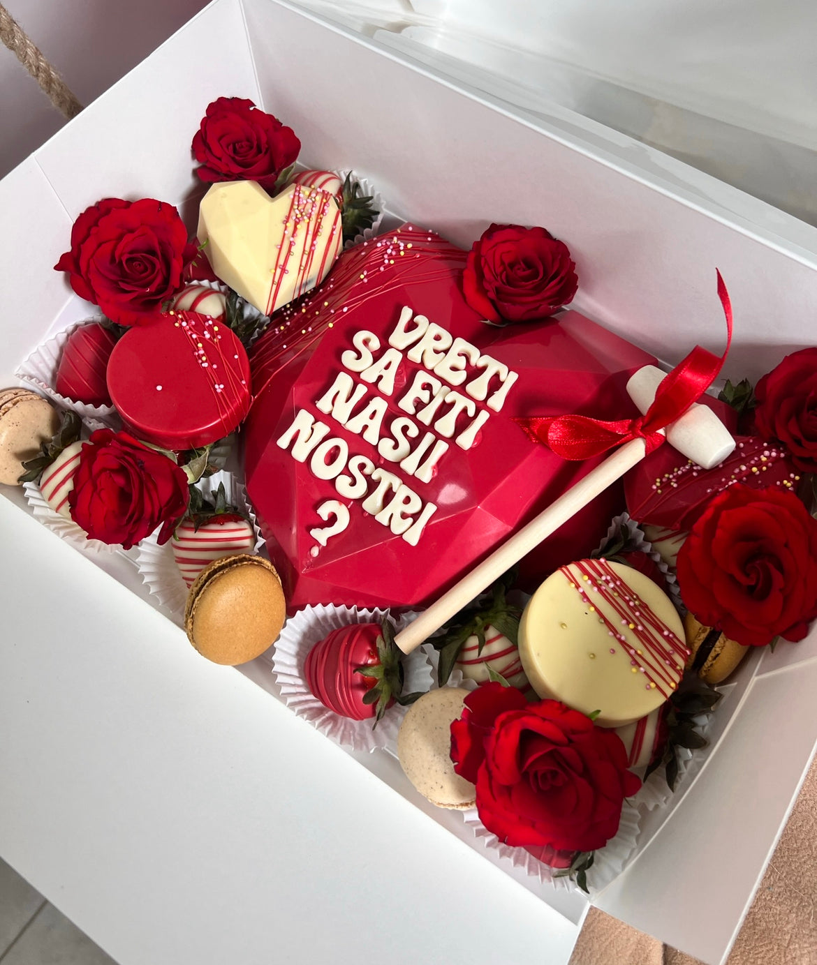 Cutia conține carcasa inima de ciocolata,ciocan,capsuni in ciocolata, oreo in ciocolata, macarons si trandafiri.