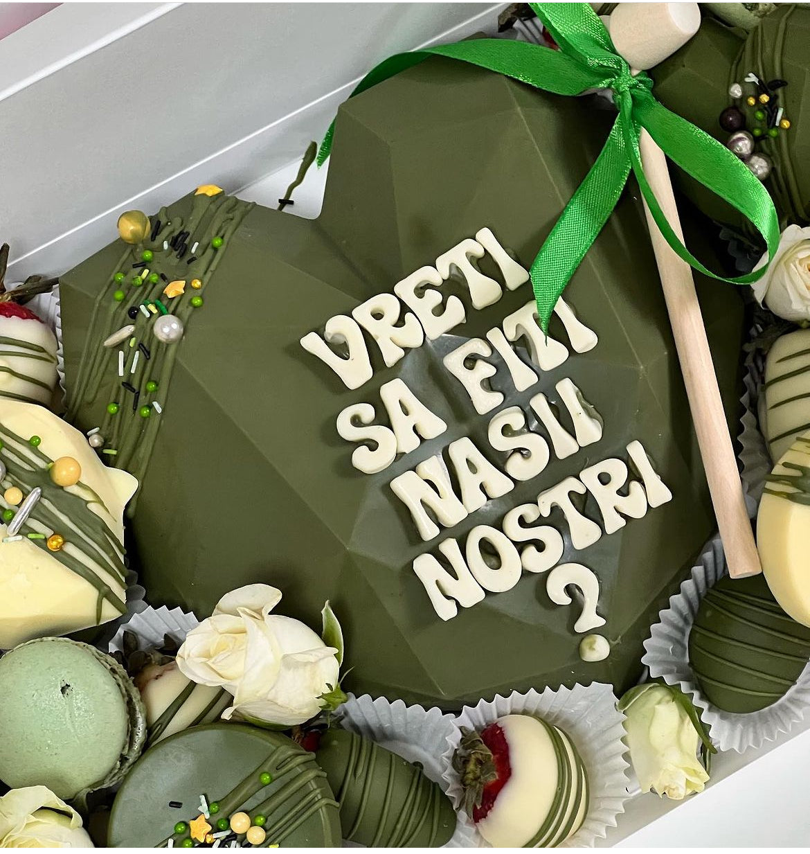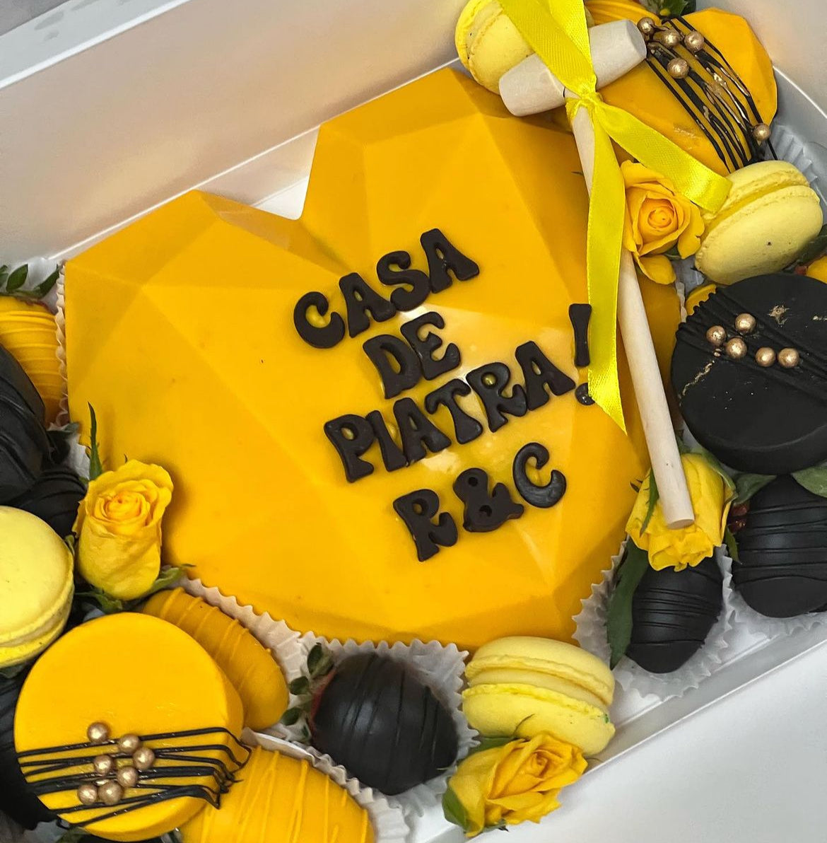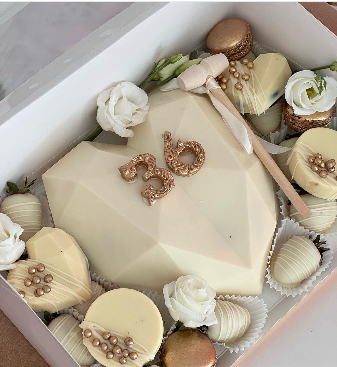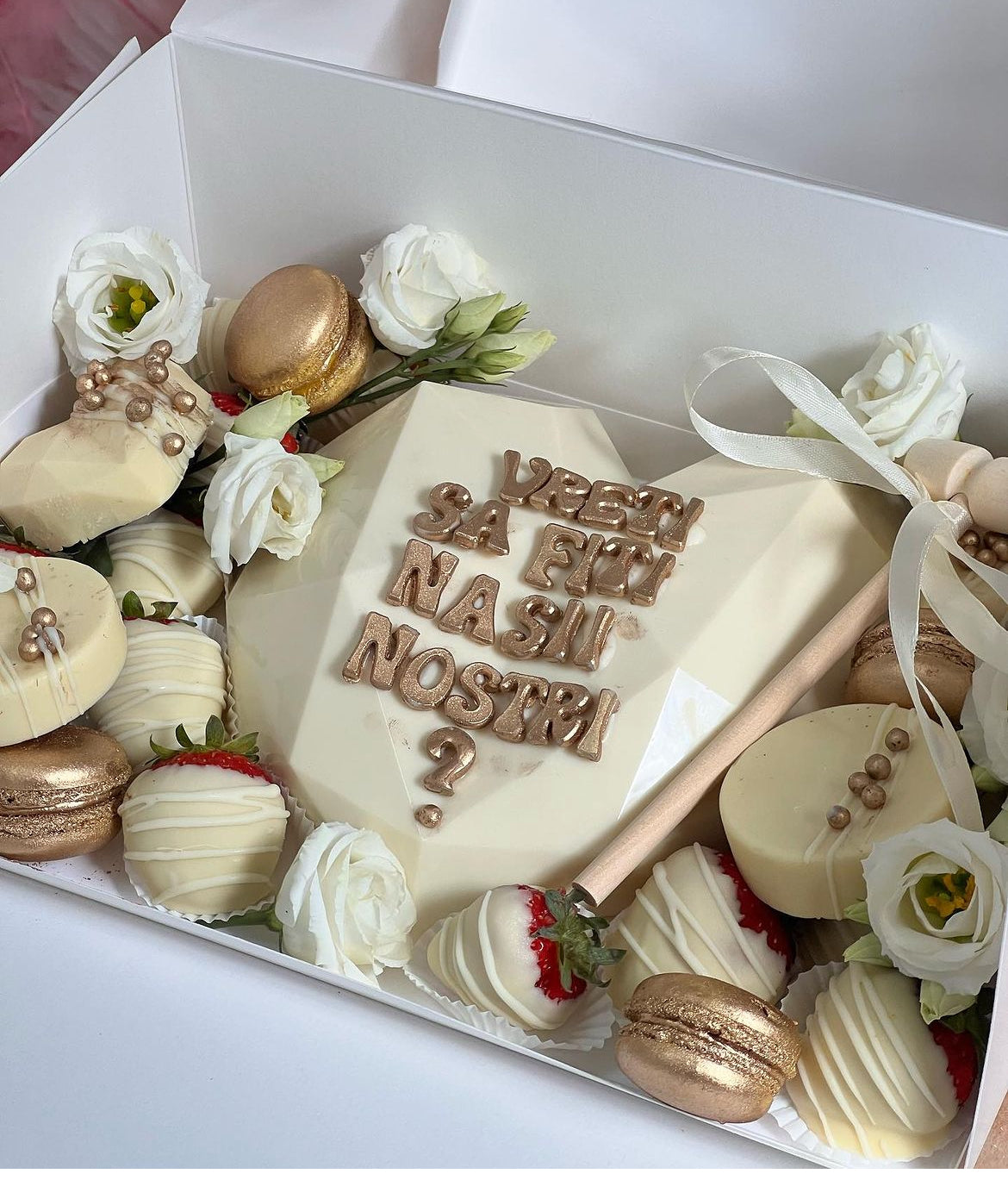 Cutia conține carcasa inima de ciocolata,ciocan,capsuni in ciocolata, oreo in ciocolata, macarons si trandafiri.