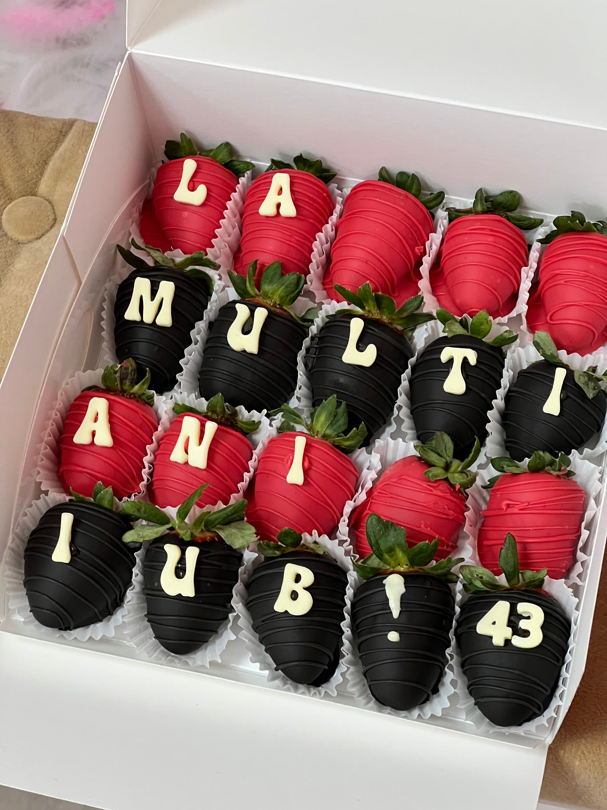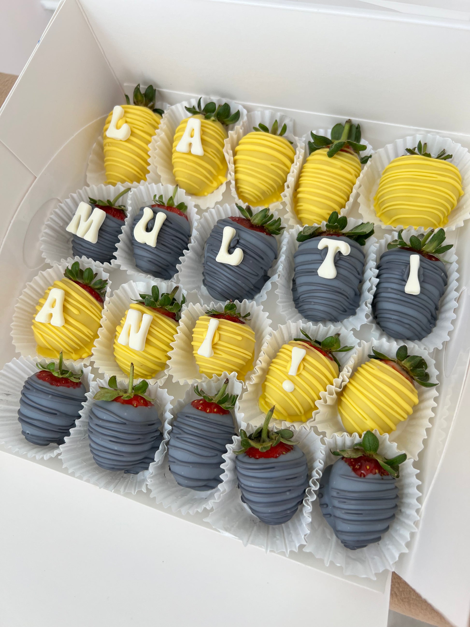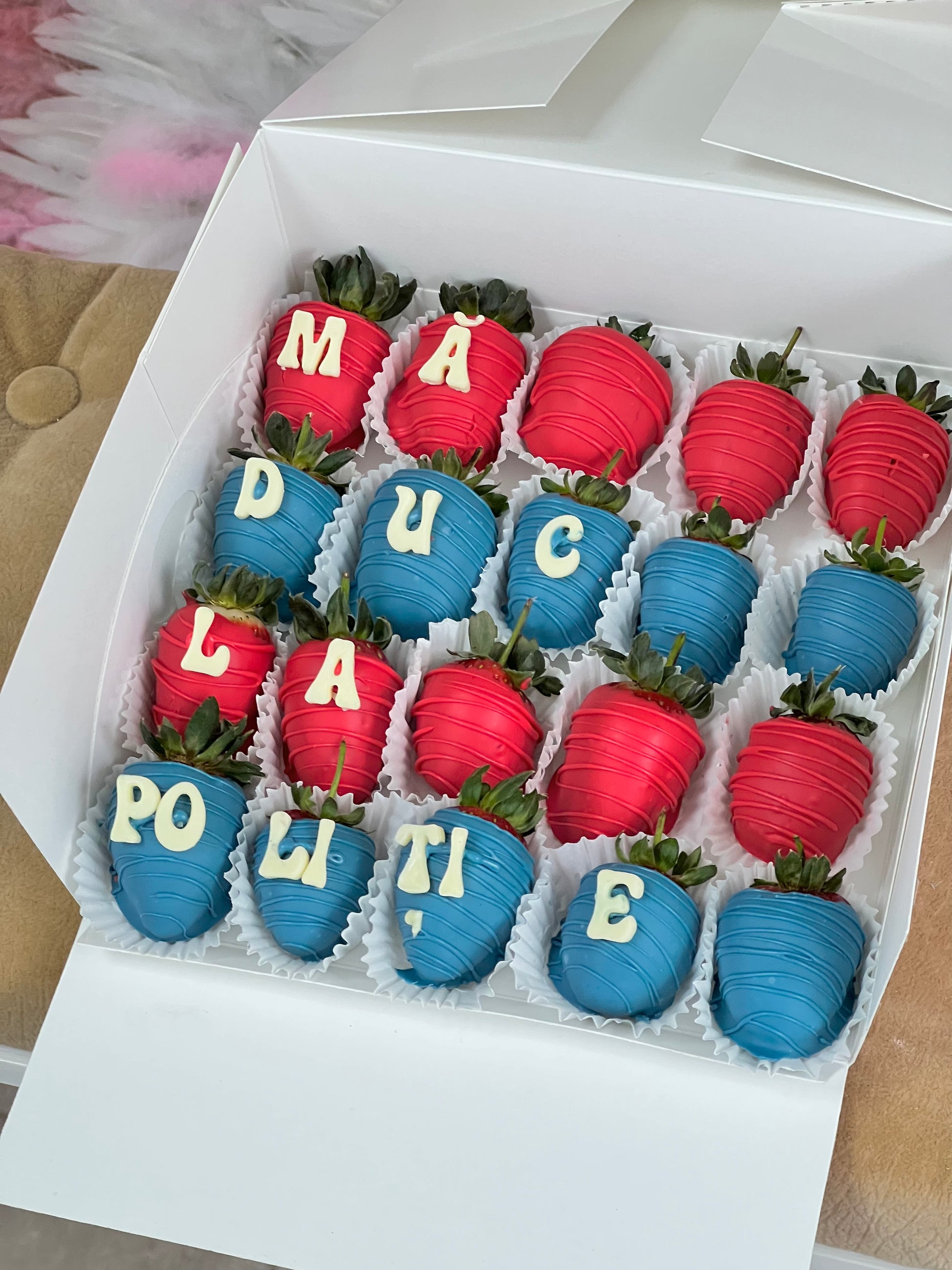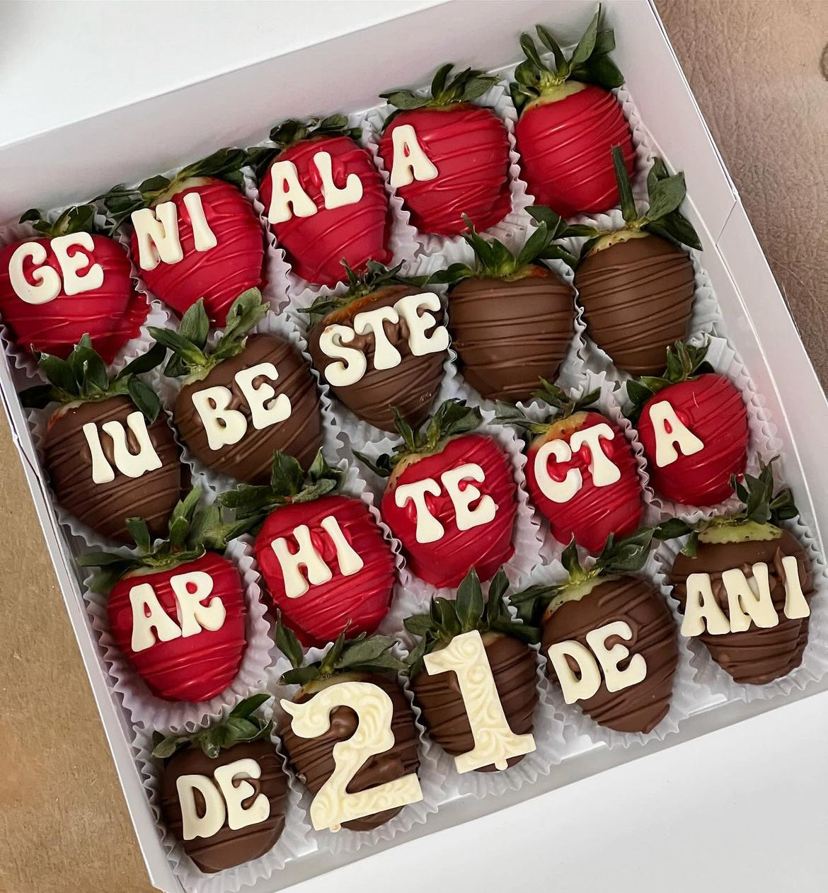 Box-urile se pot personaliza cu text/varsta si culori la alegere pe care le selectati in momentul plasarii comenzii. Pentru combinatiile de culori care includ culoarea alb, drip-ul(liniile) va fi in culoarea opusa (ex. pentru rosu si alb, dirp-ul de pe capsunile rosi va fi alb iar cel de pe capsunile albe va fi rosu)