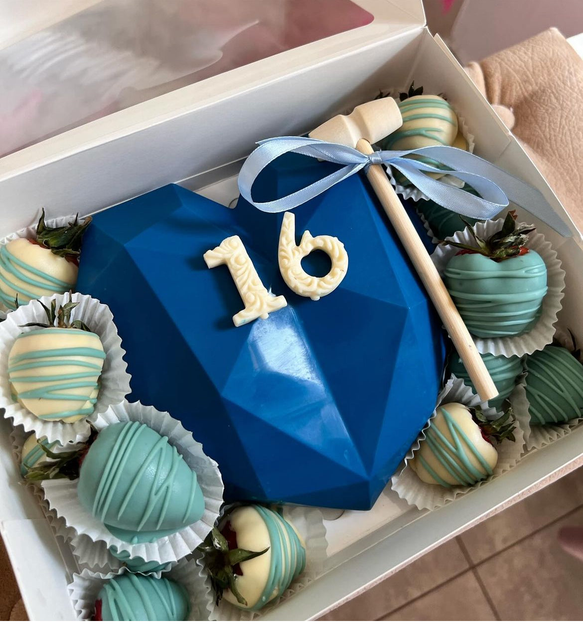 Cutia conține carcasa inima de ciocolata,ciocan si capsuni in ciocolata.