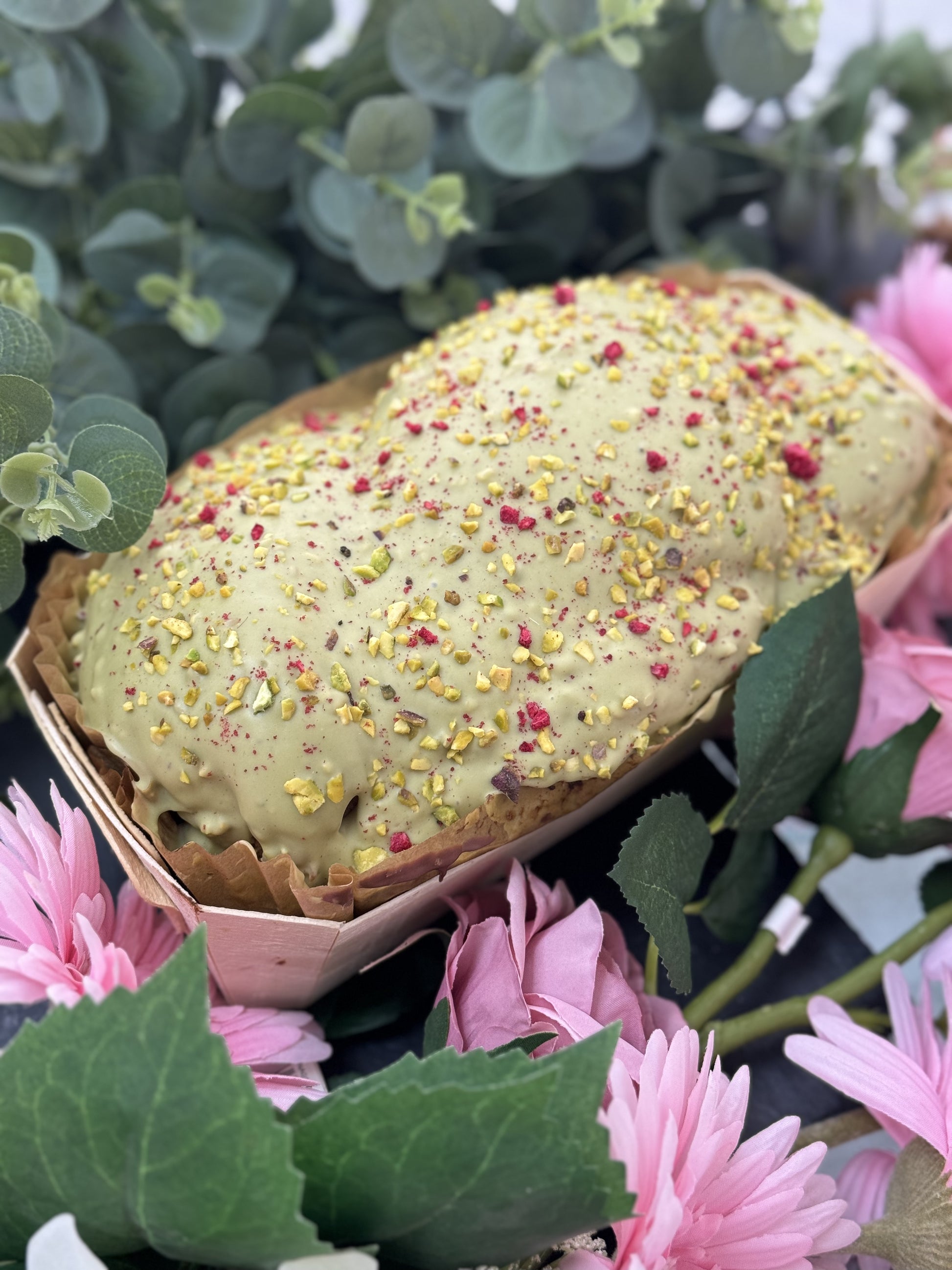 Bucură-te de o experiență de neuitat cu cozonacul nostru glazurat cu ciocolată albă și inserție de fistic! Gustul rafinat al ciocolatei albe se împletește armonios cu aroma intensă a fisticului, oferindu-ți o explozie de savoare în fiecare mușcătură. Crocant la exterior și moale la interior, acest cozonac este o încântare pentru simțuri. Savurează momente de dulce bucurie și comandă acum acest deliciu rafinat!